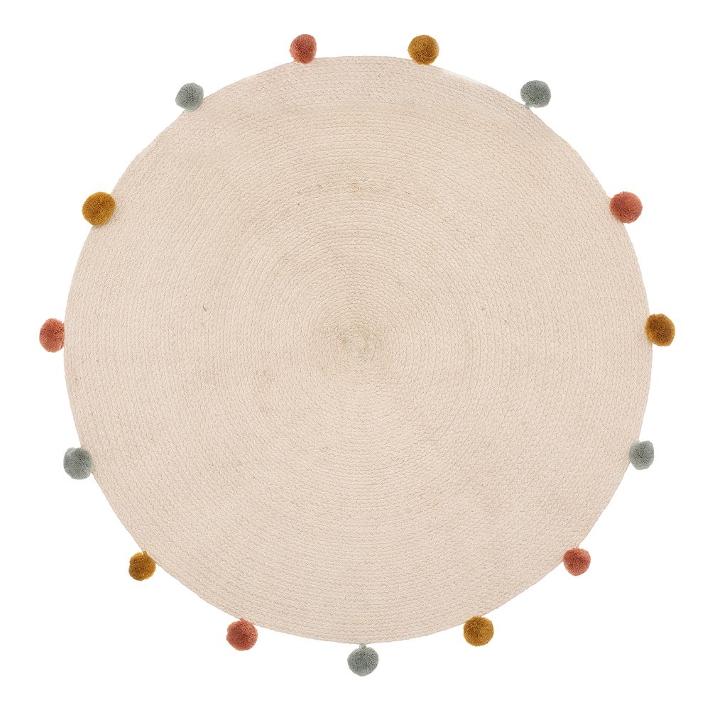 Alfombra decorativa de diseño Arlequín en formato redondo, con borlas de algodón que aportan un toque artesanal y acogedor. Ideal para complementar la decoración de dormitorios, salas o espacios infantiles. Confeccionada en algodón para mayor suavidad y confort.