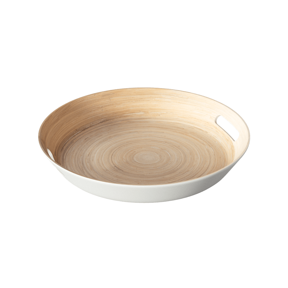Bandeja de bambú blanca que combina funcionalidad y diseño decorativo para servir o decorar.