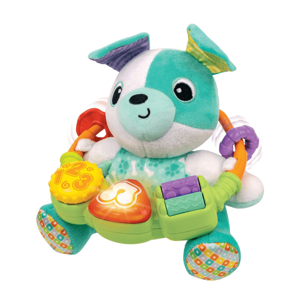 | Funciones | Perrito de peluche con aro de actividades: Orejas con sonido crujiente y aro desmontable con rodillos, cuentas y girador. Presiona y gira el botón circular o el triángulo para escuchar sonidos, frases, canciones y melodías con luz intermitente. |