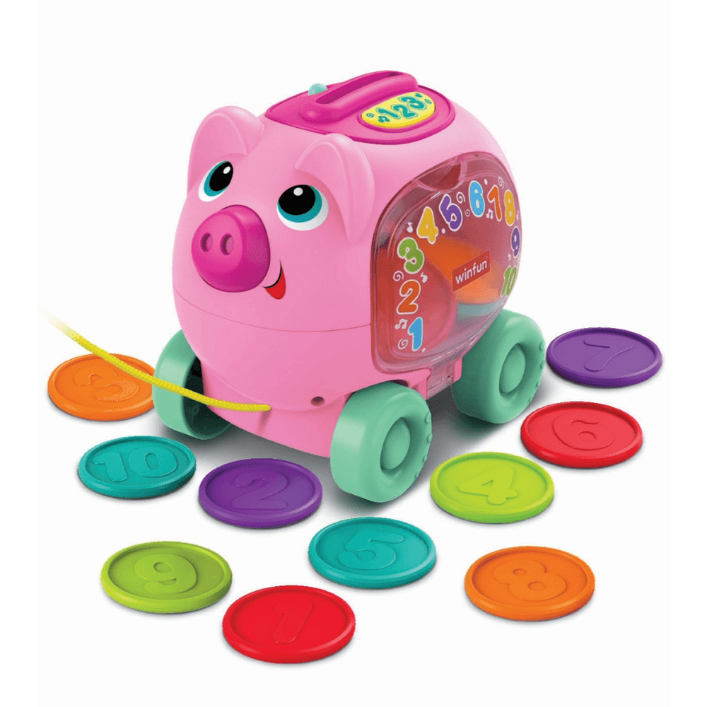 | Funciones | Cerdito bilingüe con monedas de colores: Modo 1: Inserta las monedas para aprender a contar. Presiona la nariz para escuchar frases y melodías. Modo 2: Inserta las monedas para reproducir canciones. Presiona la nariz para pasar a la siguiente melodía. Puerta transparente para recuperar fácilmente las monedas. Incluye 10 monedas de colores con números y vegetales en relieve. |