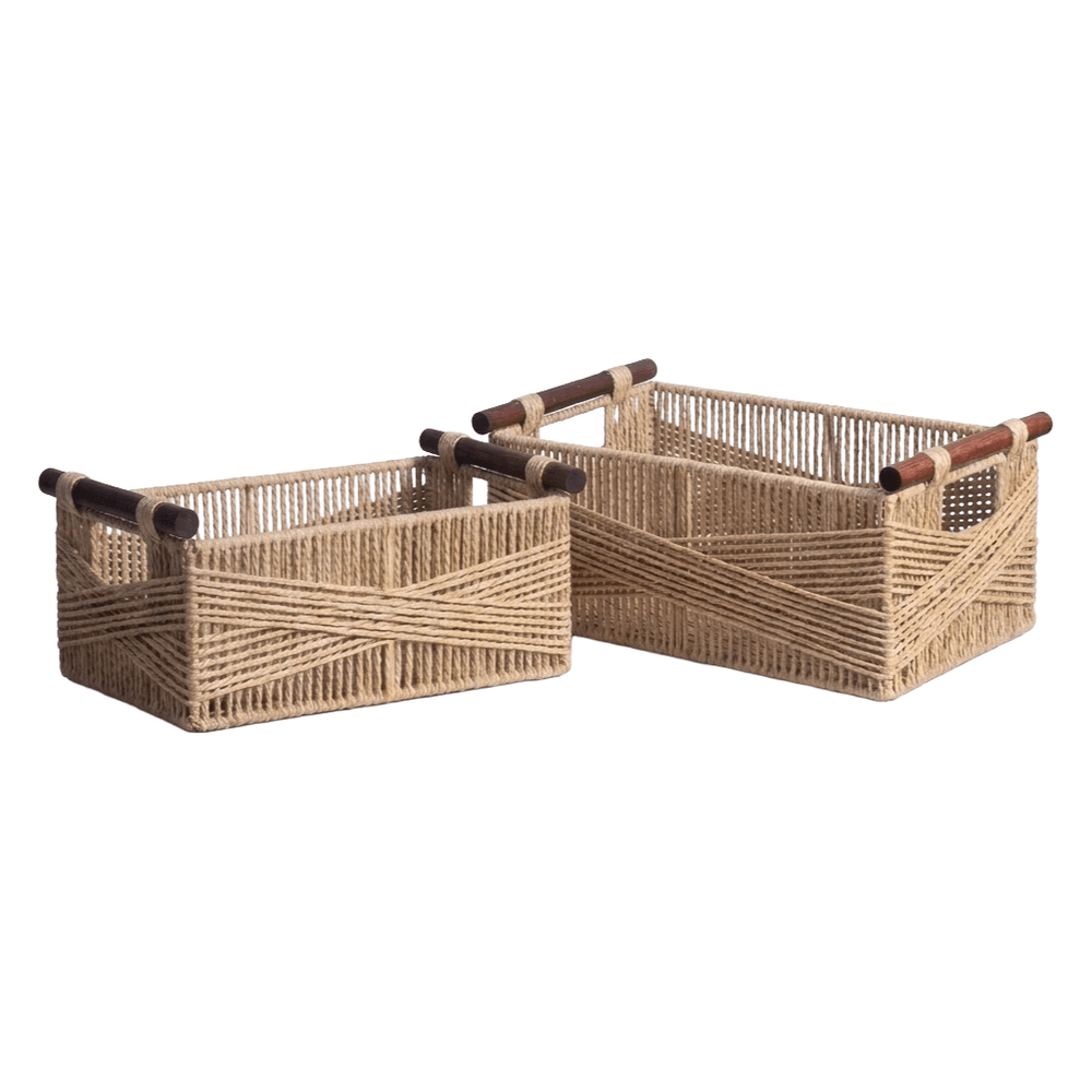 Cesta organizadora elaborada en mimbre en tono beige natural, equipada con asas laterales que facilitan su transporte. Su tamaño amplio permite almacenar ropa ligera, textiles, juguetes o artículos del hogar, manteniendo los espacios ordenados con un estilo decorativo cálido y funcional.