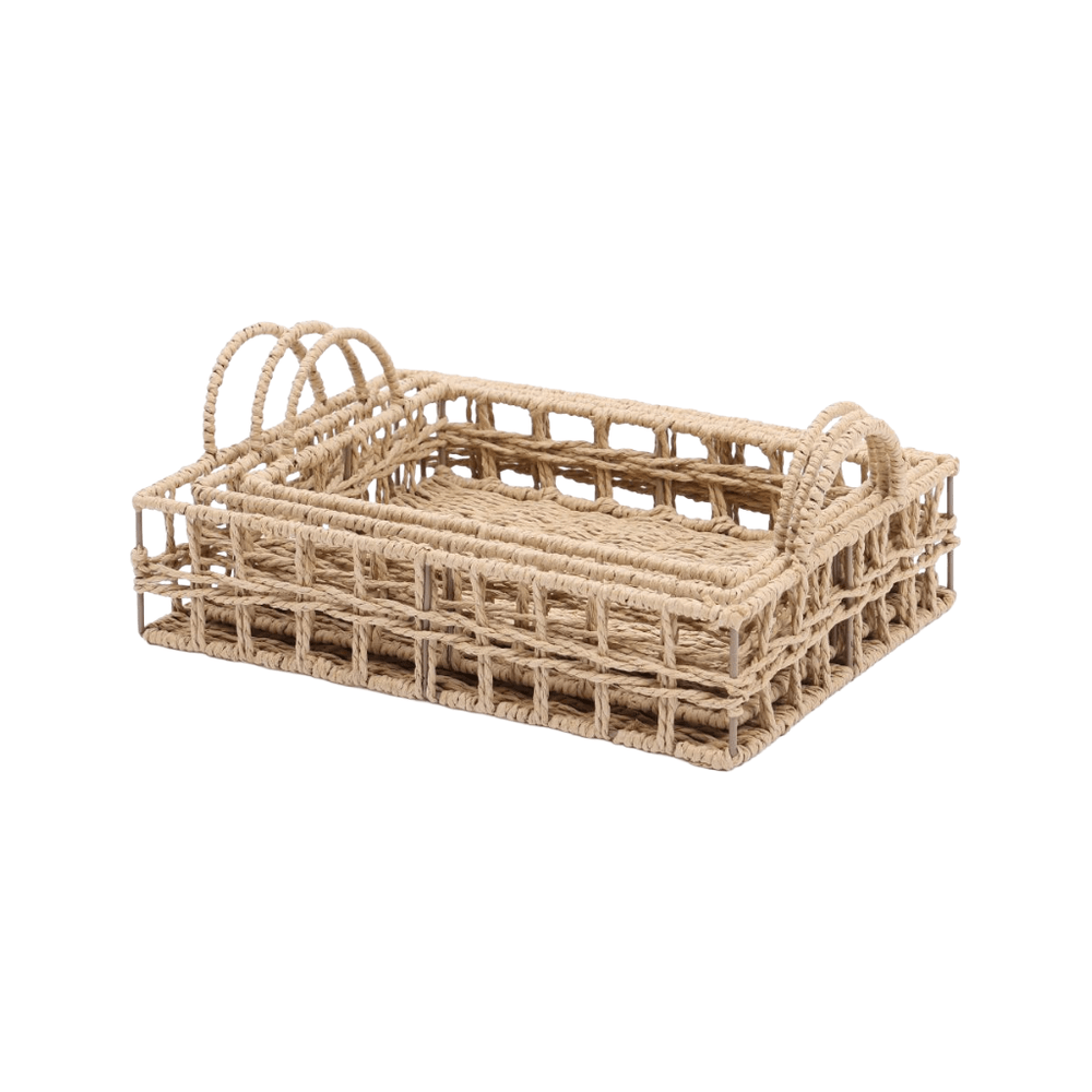 Cesta organizadora confeccionada en mimbre y papel en tono beige, diseñada para ofrecer resistencia y un acabado decorativo natural. Ideal para organizar accesorios, documentos o artículos del hogar, manteniendo el orden con estilo y funcionalidad.