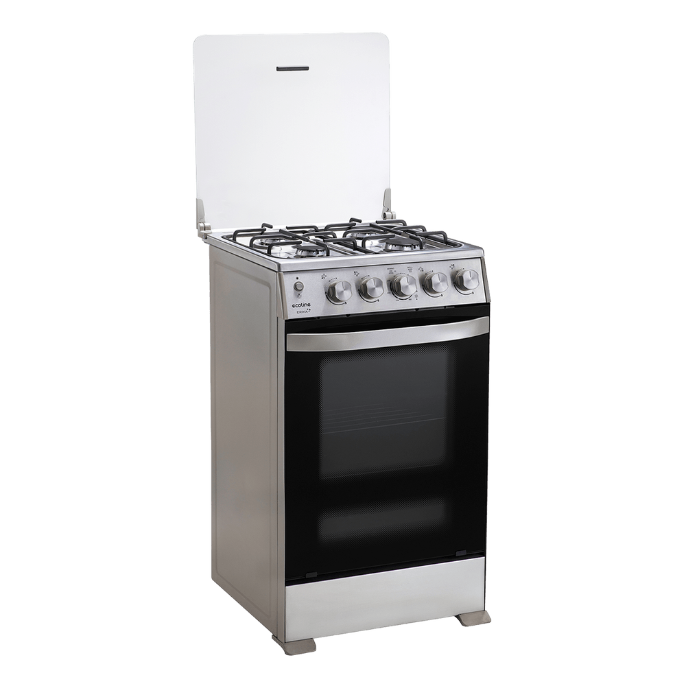 Cocina con horno de 21" con encendido eléctrico, equipada con un tablero de acero inoxidable y cuatro quemadores sellados (tres medianos y uno grande), con bases de aluminio y tapillas en negro mate. Incluye vidrio reflectivo en el horno y encendido eléctrico tanto en los quemadores como en el horno y el grill. La cocina cuenta con dos parrillas de fundición, un horno porcelanizado extra grande con capacidad de 64 litros, y un vidrio de tapa templado serigrafiado. Su diseño moderno incluye un vidrio panorámico reflectivo en el horno, vidrio interior extraíble en la puerta, bandeja de goteo, grill, doble broil de 23.3 litros, gratinador y descongelador en la cavidad interior, además de luz interna con dos focos. La parrilla del horno es enlozada y presenta un nuevo diseño en perillas, manija y patas.