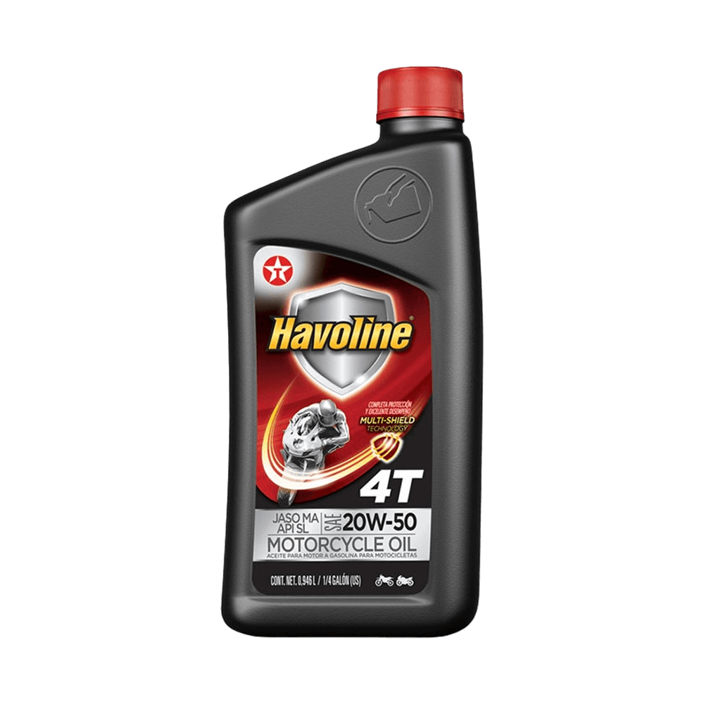 Los aceites Havoline Motorcycle Oils 4T with Multi-Shield Technology son aceites de calidad Premium. El grado SAE 20W-50 proporciona una protección completa para los motores, embragues y cajas de cambios de motocicletas. El grado SAE 20W-50 proporciona excelente estabilidad térmica, una transferencia de potencia óptima y cambio eficiente. Recomendado para motores 4T de motocicletas incluyendo modelos de Honda, Suzuki, Yamaha y Bajaj que requieren esa especificación.