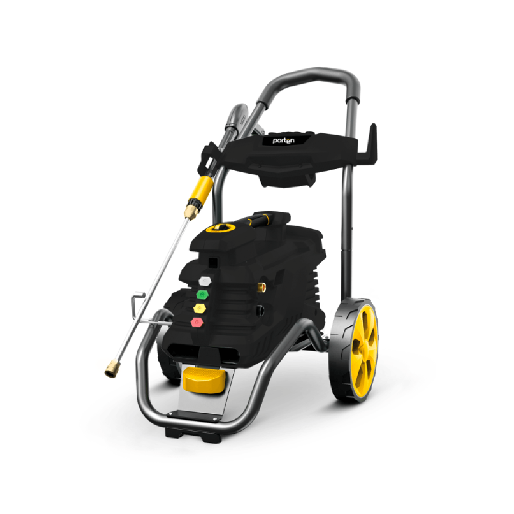 Lavadora a presión monofásica marca Porten. Cuenta con un motor de 2.8HP para trabajos profesionales; tiene incorporado un protector térmico que cuida al motor de la variación de voltaje. La presión que genera es de 1885 PSI, puede lanzar 2.64 gl/min y 10 L/min de agua. Es la herramienta ideal para realizar trabajos de limpieza en el hogar, como lavar autos, motos, bicicletas, patios, jardines, paredes, ventanas, entre otros. El tiempo de trabajo ocacional de esta máquina es de 1 a 3 horas. Incluye pistola, lanzadera con acoples para boquillas, boquillas de alta presión, boquilla para aplicar shampoo, boquilla turbo, manguera de jardín con conector rápido y manguera de alta presión de 8m.