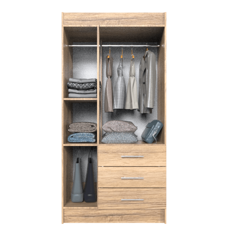 Armario de 3 puertas con 3 cajones inferiores. Su puerta lateral cuenta con repisas para mayor organización y gran comodidad