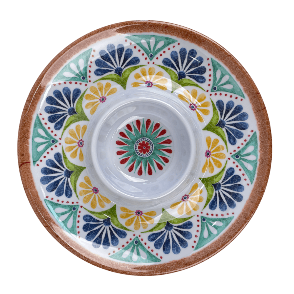 Bandeja multifuncional perfecta para servir aperitivos, con un espacio central para salsas o dips. Ideal para reuniones sociales, fiestas o cenas informales.