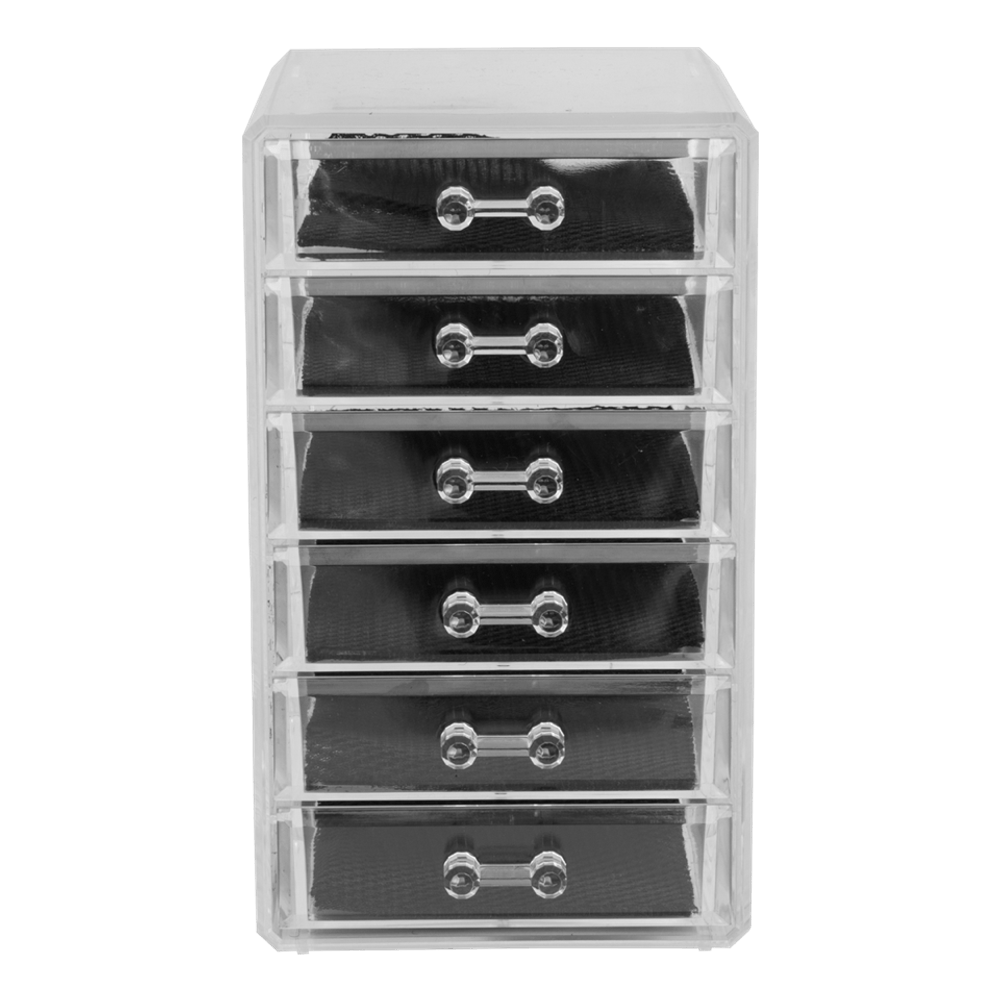 Mantén organizado tus pequeños accesorios personales o bisuterías con este práctico organizador, contiene 6 cajones que te permitirán clasificar y organizar de manera ordena lo que desees. Complementos: Contiene 6 cajones. Elaborado en acrílico Dimensiones: 12 x 13 x 21 cm