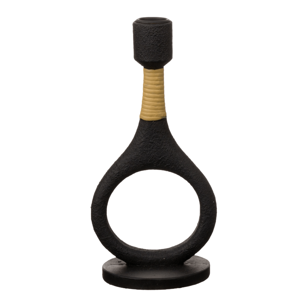 Esta escultura de diseño moderno con forma circular alargada y base sólida representa la armonía entre la elegancia y la simplicidad. Elaborada en poliresina negra con detalles dorados sutiles en el cuello, es ideal para espacios que combinan arte y funcionalidad. Su forma abierta invita a la luz a atravesarla, proyectando sombras únicas que cambian con el paso del día. Perfecta para realzar mesas auxiliares, estantes flotantes o entradas modernas, esta pieza es un símbolo de sofisticación y estilo contemporáneo que transforma cualquier ambiente en una galería de diseño.