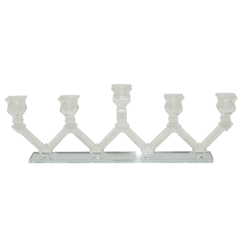Candelabro lineal de cinco brazos elaborado en vidrio transparente sobre base rectangular. Ideal para crear un punto focal elegante en mesas o consolas. Su diseño simétrico aporta equilibrio visual y un aire sofisticado. Perfecto para cenas formales, decoración navideña o ambientes de estilo clásico-moderno.