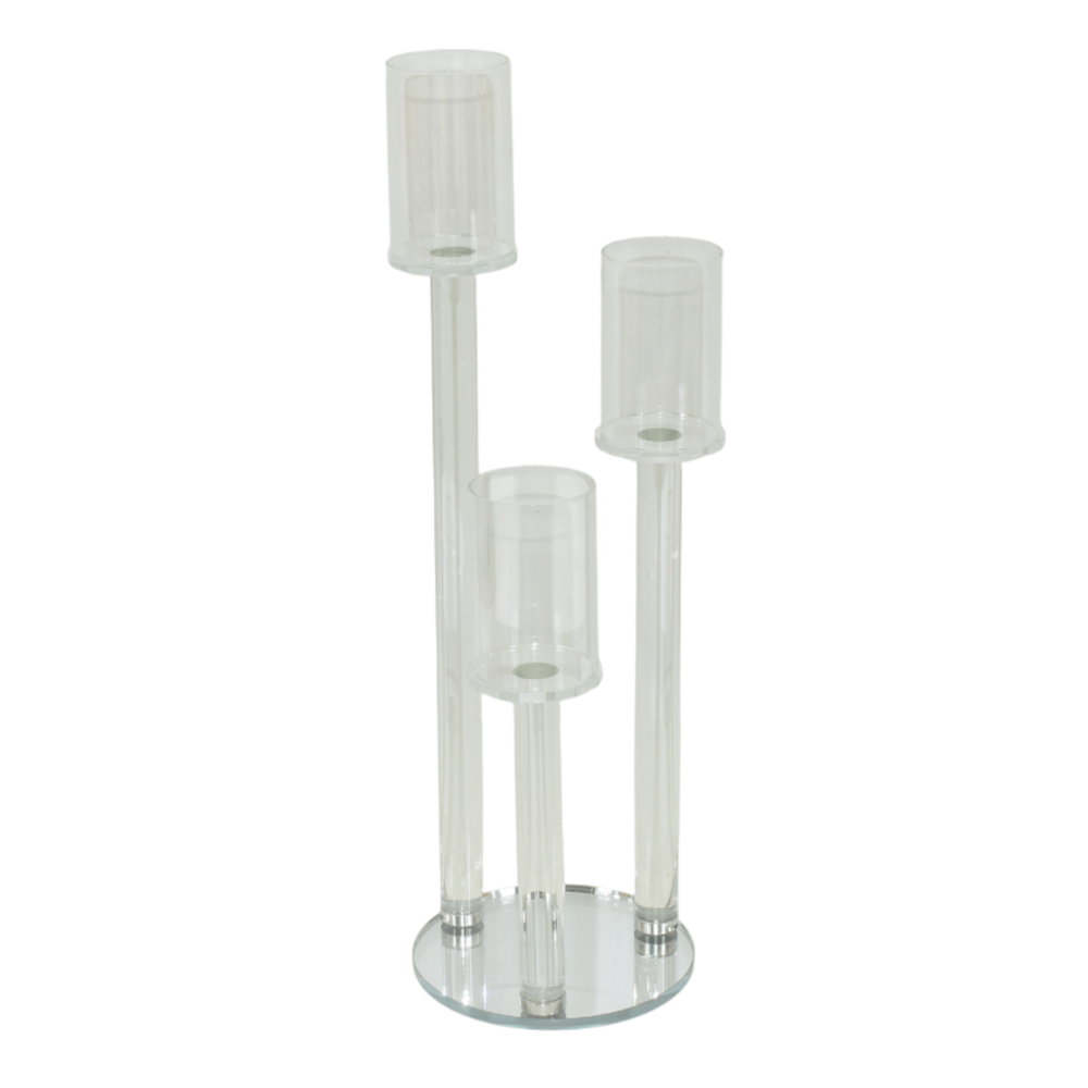 Candelabro de tres brazos dispuestos en forma vertical con base redonda. Perfecto para decoraciones simétricas en recibidores o comedores. Su altura y transparencia aportan luz, verticalidad y modernidad.