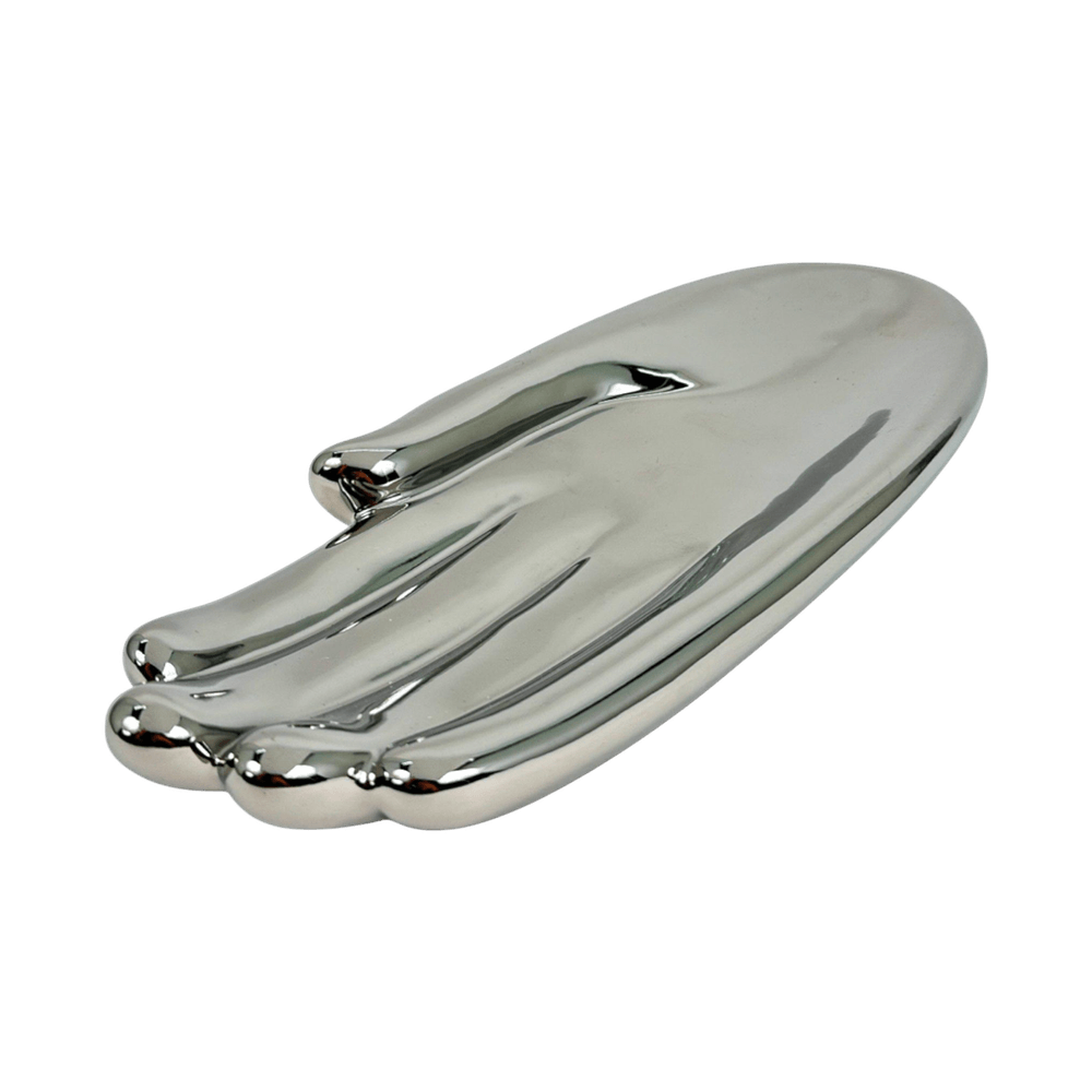 Un portaobjetos con diseño de mano en acabado cromado, perfecto para almacenar accesorios pequeños con estilo y funcionalidad. Su forma artística y su brillo metálico lo convierten en un elemento decorativo único.