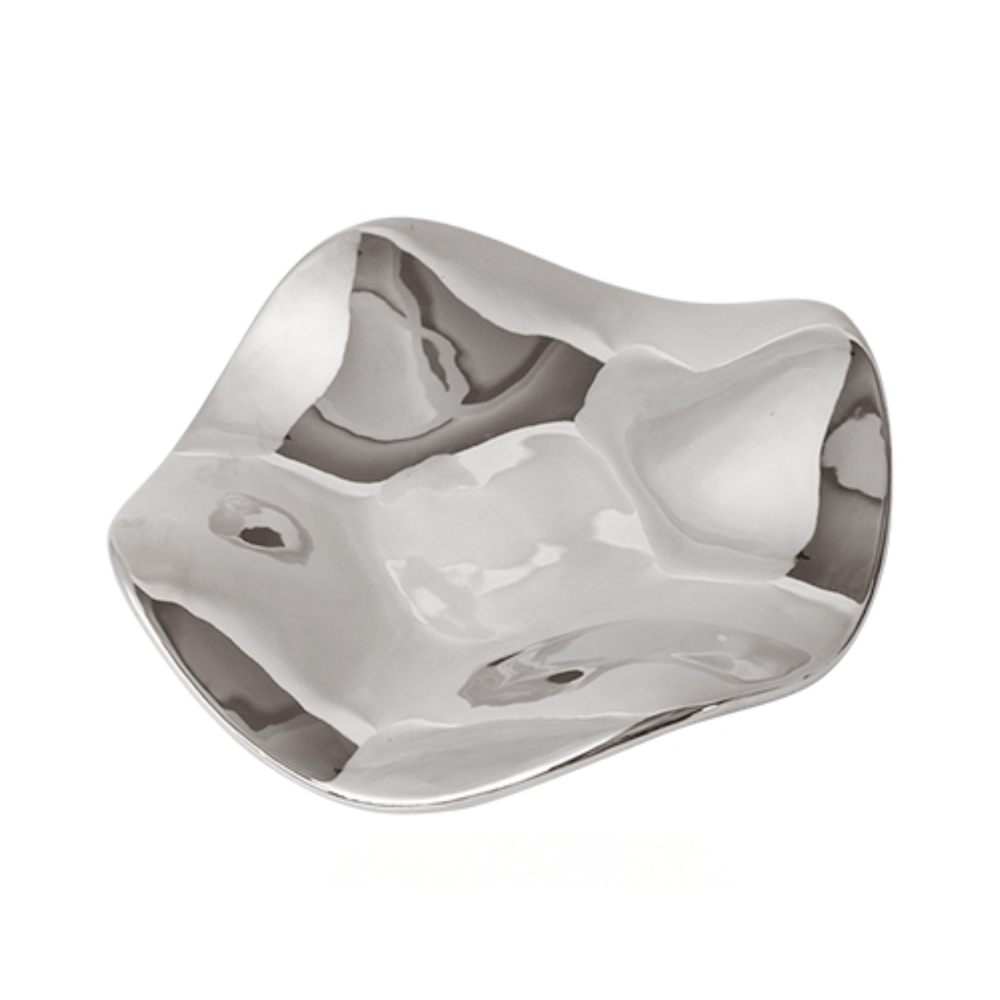 Esta bandeja cerámica con acabado espejo plateado y forma orgánica es una joya para superficies como tocadores, mesas auxiliares o entradas. Refleja la luz suavemente, otorgando elegancia sutil. Ideal para colocar perfumes, joyería o velas, combina belleza escultural con funcionalidad. Encaja perfectamente en ambientes contemporáneos o minimalistas que buscan acentos luminosos.