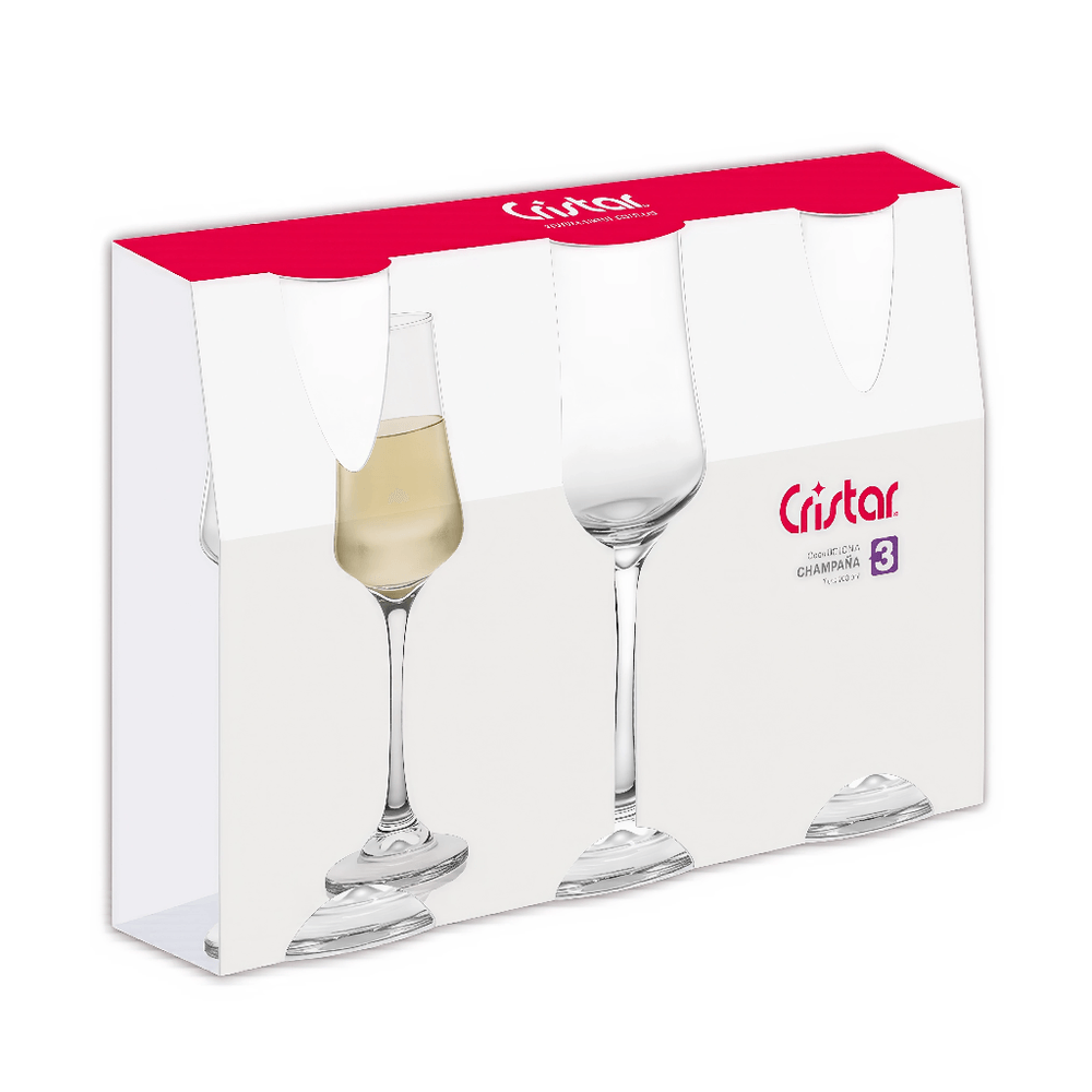 Set de 3 copas de champagne de la línea Bolonia, con capacidad de 200 ml. Elegantes y resistentes, perfectas para brindar en celebraciones y eventos especiales.
