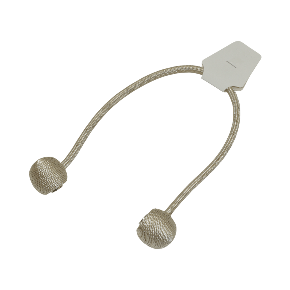 Elegante sujetador de cortina en tono beige suave con esferas metálicas decorativas en los extremos. Su diseño flexible permite ajustarlo fácilmente sin necesidad de ganchos o perforaciones, ideal para añadir un toque sofisticado a cualquier cortina. Perfecto para salas de estar, dormitorios o espacios con una decoración clásica y refinada.