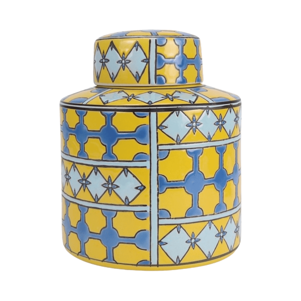 Jarrón de cerámica decorativorado con patrón geométrico amarillo y azul. Llama la atención por su diseño audaz. Perfecto como acento en espacios modernos, mediterráneos o eclécticos.