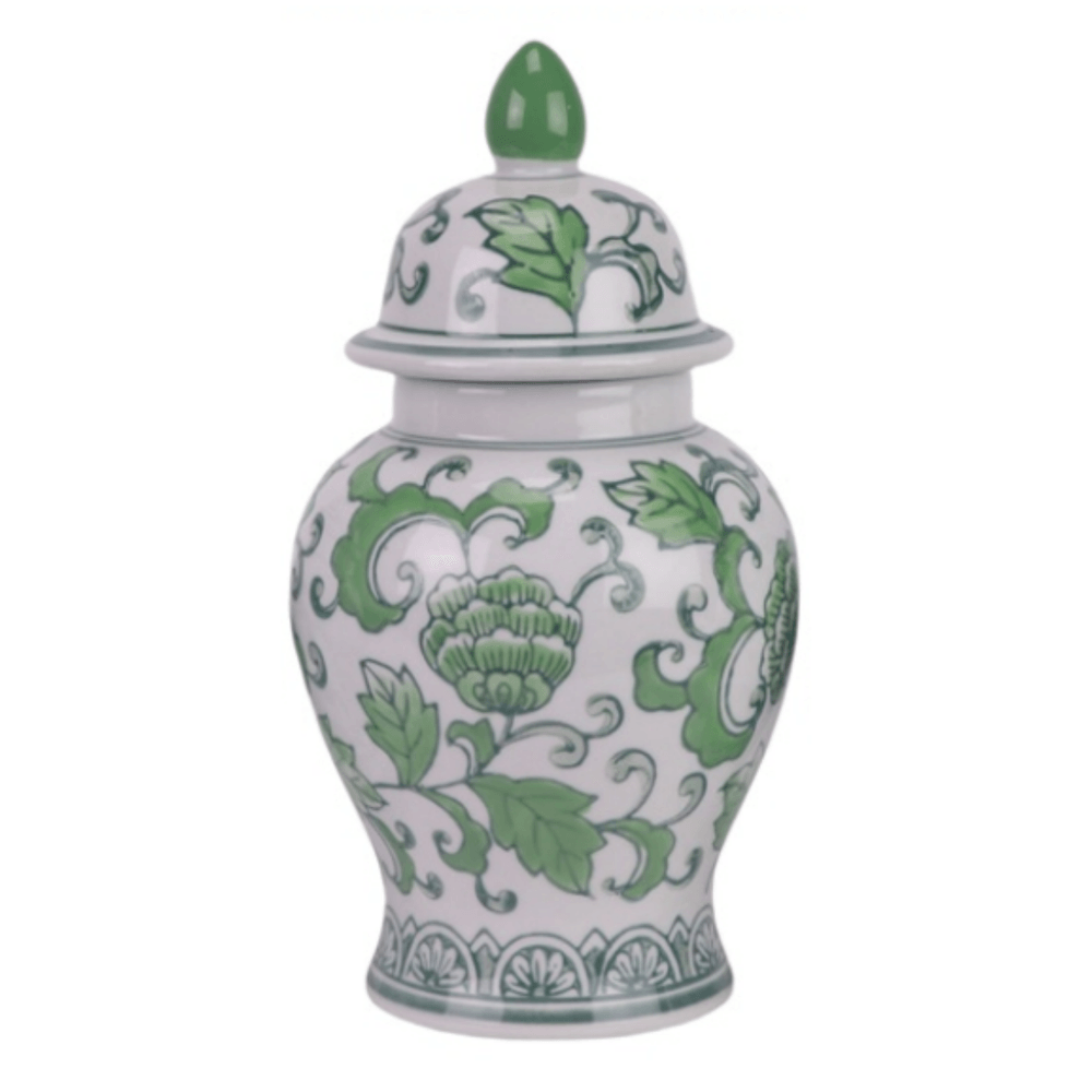 Jarrón botanical con tapa verde con flores azul 26 x 13 cm