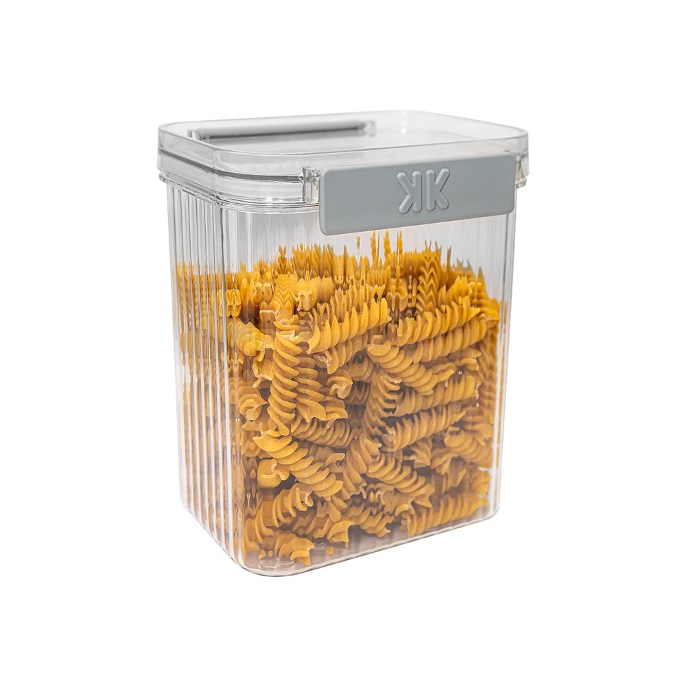 Recipiente rectangular de 1.3 litros con tapa café camel. Perfecto para almacenar pastas, harinas o galletas. Su formato permite ahorrar espacio en la despensa.