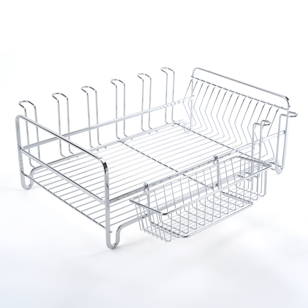 Platera cromada de un solo nivel, ideal para organizar platos de manera eficiente. Su diseño compacto y resistente es perfecto para cocinas pequeñas o grandes, proporcionando un espacio adicional para el secado de platos y utensilios.
