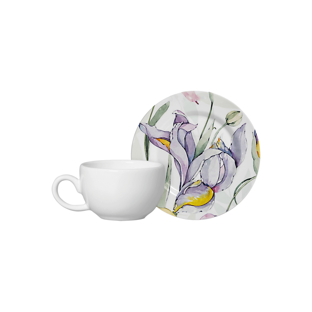 Taza de café de 85 ml con plato, perfecta para servir espresso o café corto. Parte de una colección que celebra los colores y la calidez del verano.