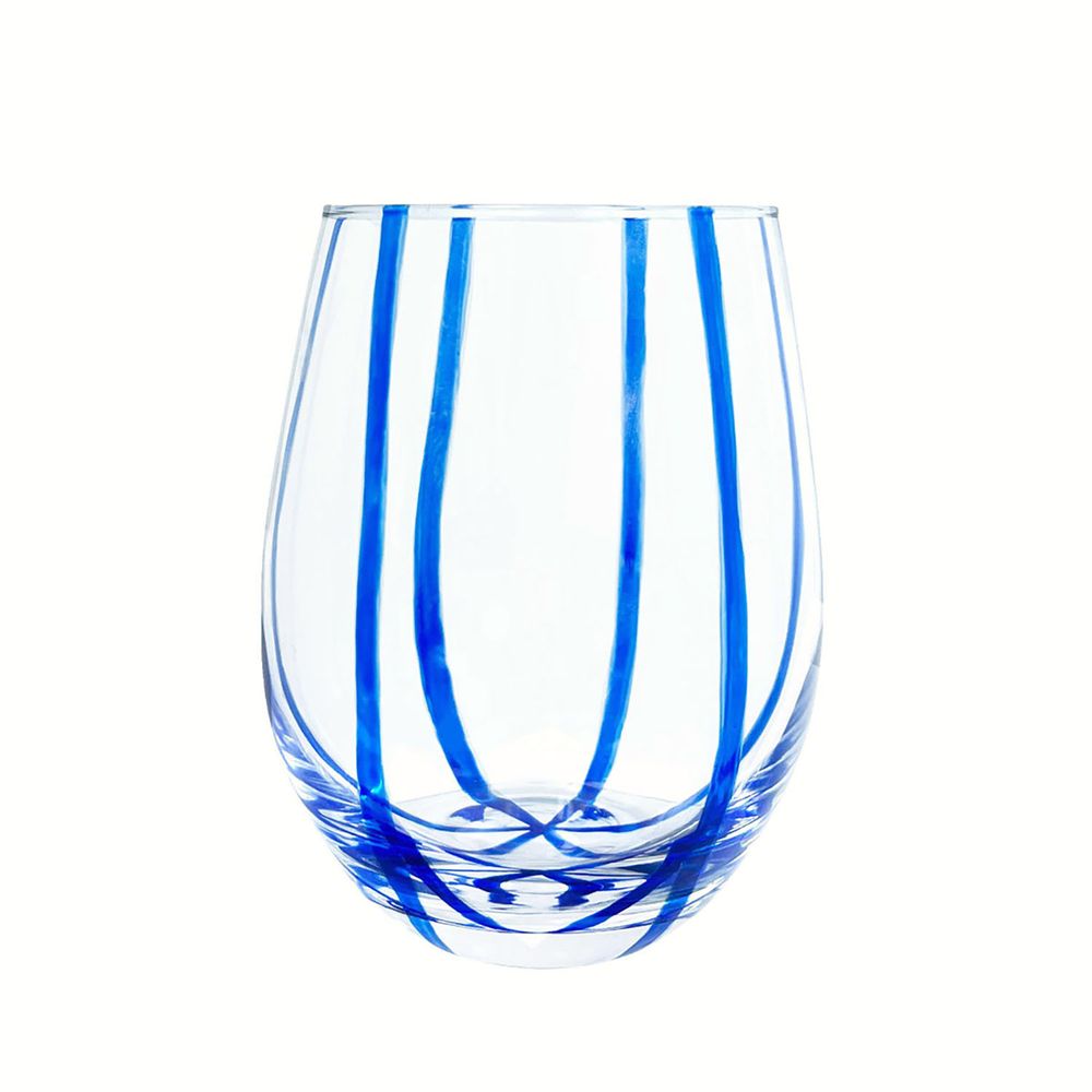 Set de 4 vasos con un elegante diseño de líneas azules. Con capacidad de 500 ml, son perfectos para servir bebidas frías con un toque decorativo y moderno.