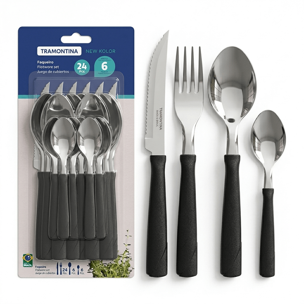 Juego de Cubiertos Tramontina New Kolor con Láminas de Acero Inoxidable y Mangos de Polipropileno Negro 24 Piezas