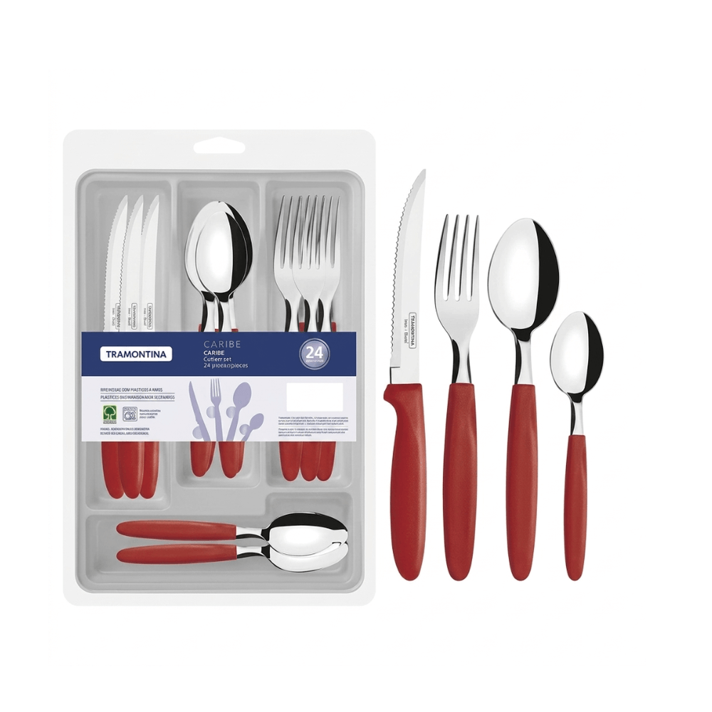 Juego de Cubiertos Tramontina Ipanema con Láminas en Acero Inoxidable y Mangos de Polipropileno Rojo con Cajonera Plástica 25 Piezas