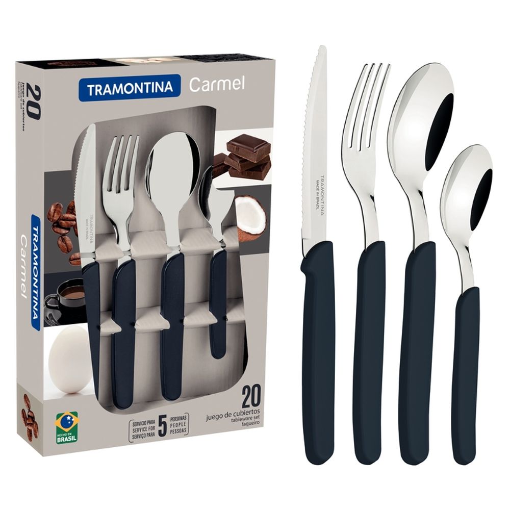 Juego de cubiertos Tramontina Carmel de 20 piezas fabricado con láminas de acero inoxidable y mangos de polipropileno en tono natural oscuro diseñado para el uso diario ofreciendo resistencia durabilidad y un estilo funcional para la mesa