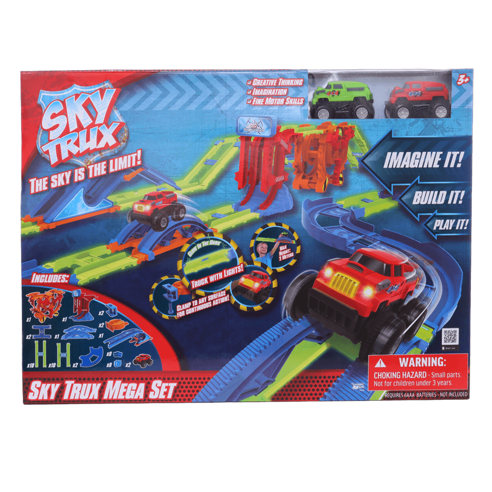 ¡Diversión extrema en la pista Sky Trux! Incluye autos, puente, loop y montaña para carreras llenas de emoción.