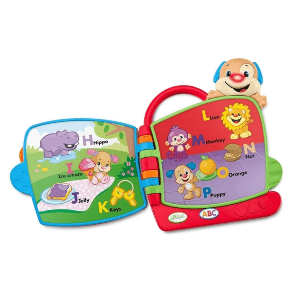 Cada vez que tu pequeño da vuelta a las páginas de este fabuloso juguete musical de libro, el Perrito canta la canción del abecedario para las letras que aparecen. Presiona el botón del "ABC" para escuchar a Perrito leerle a tu bebé cada letra y el nombre del objeto que empieza con la misma. O presiona el botón de la "Música" para activar 8 divertidas canciones ¡y ver la nariz del Perrito iluminarse mientras baila siguiendo el ritmo! El juguete interactivo Libro ABC de Perrito es el perfecto primer libro para el bebé y un excelente repaso de aprendizaje para los pequeños que iniciarán la escuela.