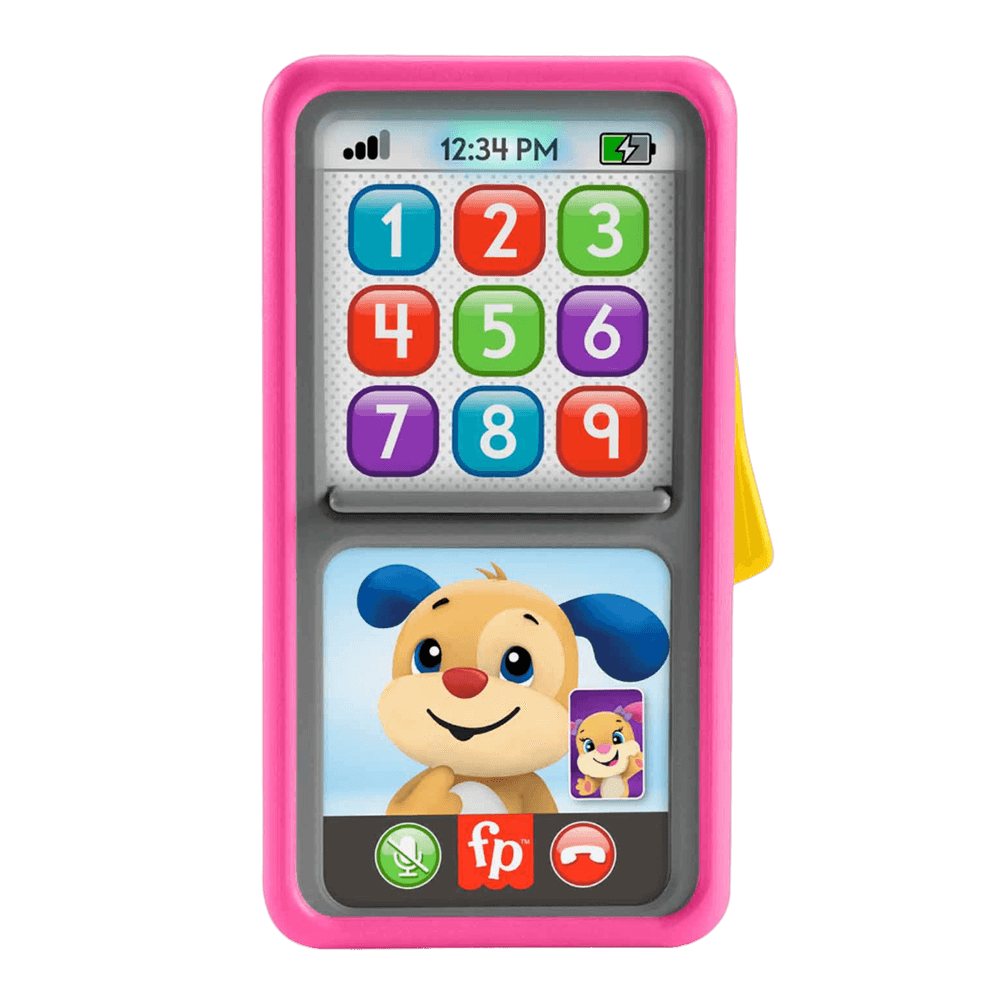 Teléfono inteligente de juguete interactivo con los amigos de Ríe y Aprende, Perrito y Hermanita, además de divertidas luces, sonidos y canciones para aprender,Cuenta con más de 75 canciones, sonidos y frases para que los niños aprendan a contar, los números, las formas, los colores, los sentimientos y el clima. Usa el botón del mundo para seleccionar un idioma: español, portugués, inglés.