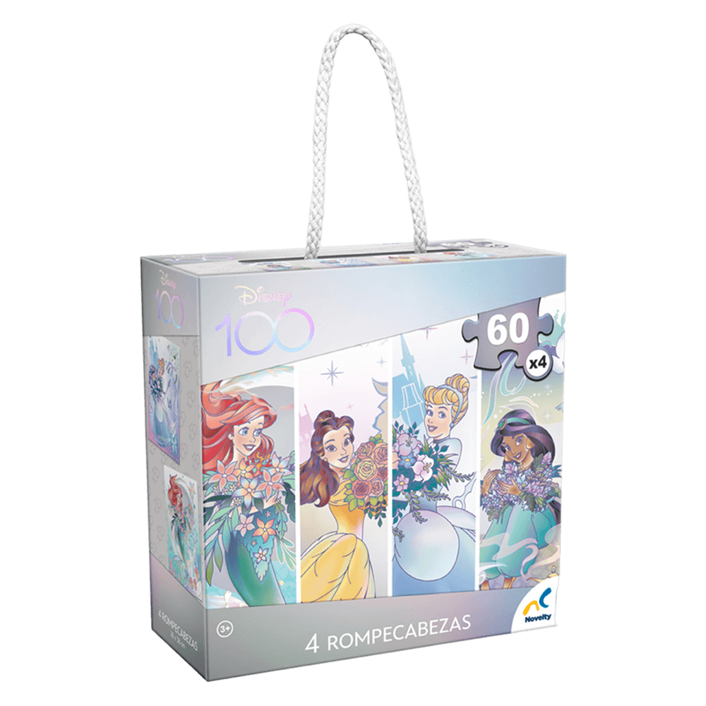 Caja con 4 rompecabezas de la colección Disney 100 diseñado con las princesas de Disney.
