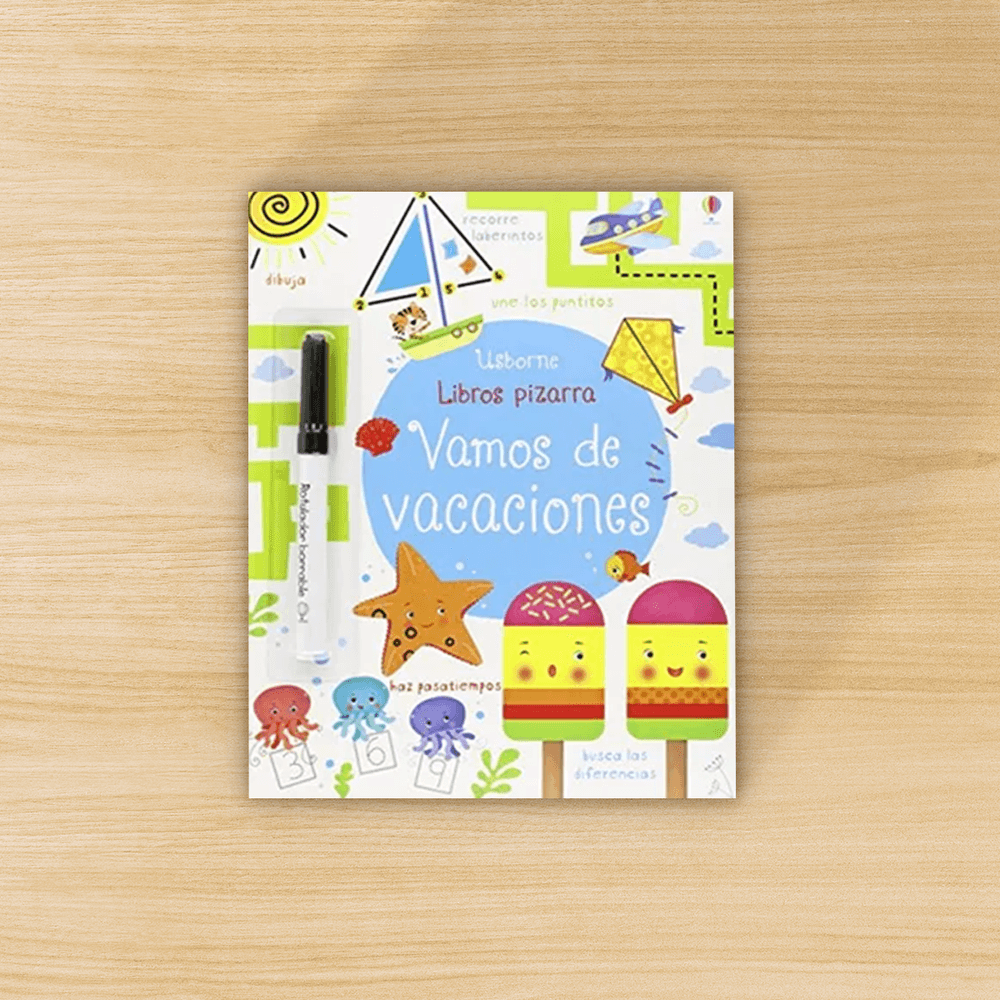 Un libro pizarra repleto de actividades relacionadas con las vacaciones, que ayudará a los niños a aprender y desarrollar distintas habilidades de forma amena y divertida, como son la capacidad de observación o el control del rotulador.