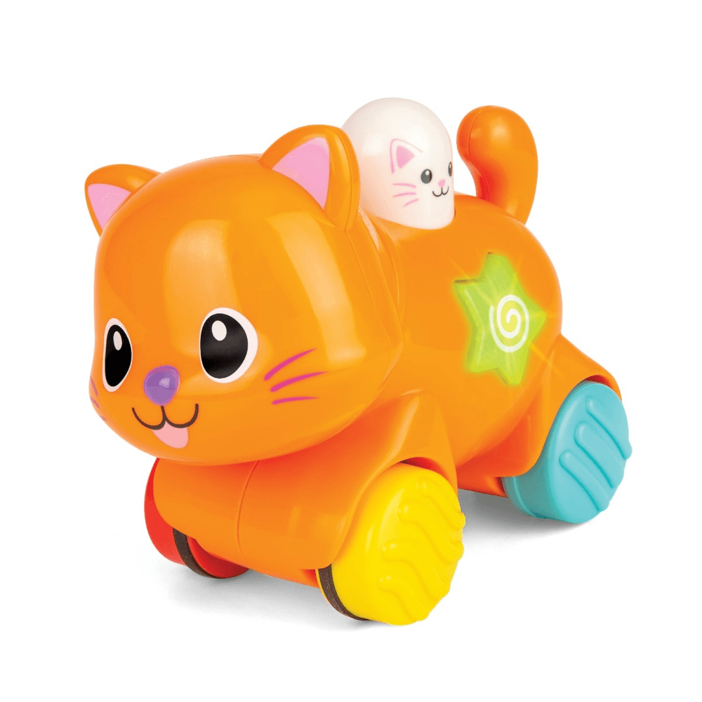 | Funciones | Amiguito rodante con luz intermitente: Botón luminoso con sonidos y melodías alegres. Al presionarlo, el juguete rueda, mueve la cabeza y emite sonidos divertidos. |