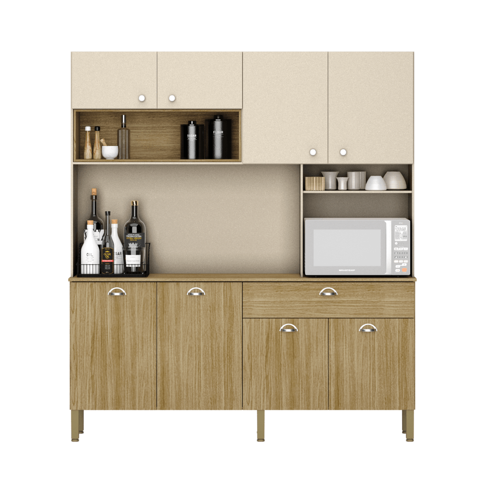 Mueble de cocina con diseño moderno y funcional, ideal para optimizar el espacio y mantener todo en orden. Su acabado en tonos madera y crema aporta calidez y elegancia, combinando perfectamente con diferentes estilos de decoración. Cuenta con múltiples compartimentos y gabinetes que brindan amplio espacio de almacenamiento para utensilios, electrodomésticos y alimentos. Un aliado práctico y estético para tu hogar.