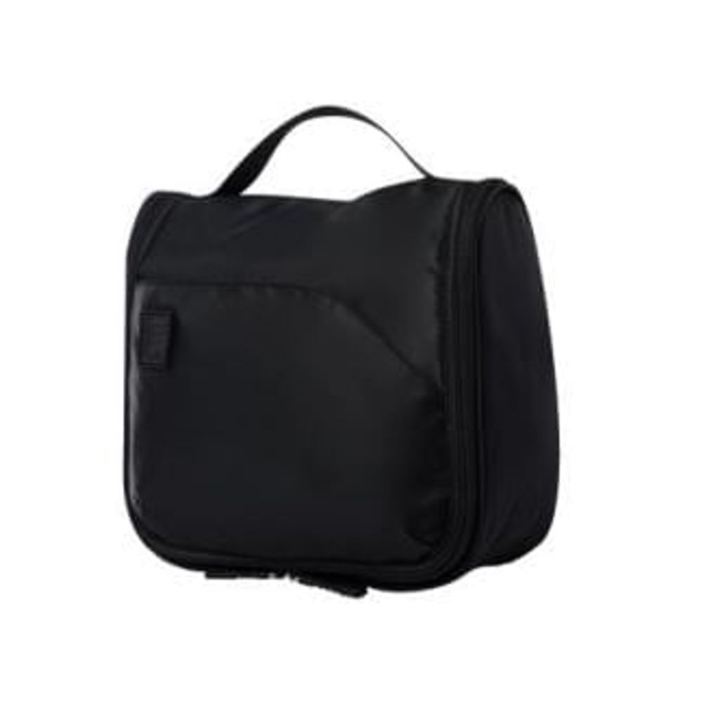 Organizador de baño para viaje Weekender negro, clásico y sofisticado, con bolsillos en malla y cremallera. Te facilitará la vida.