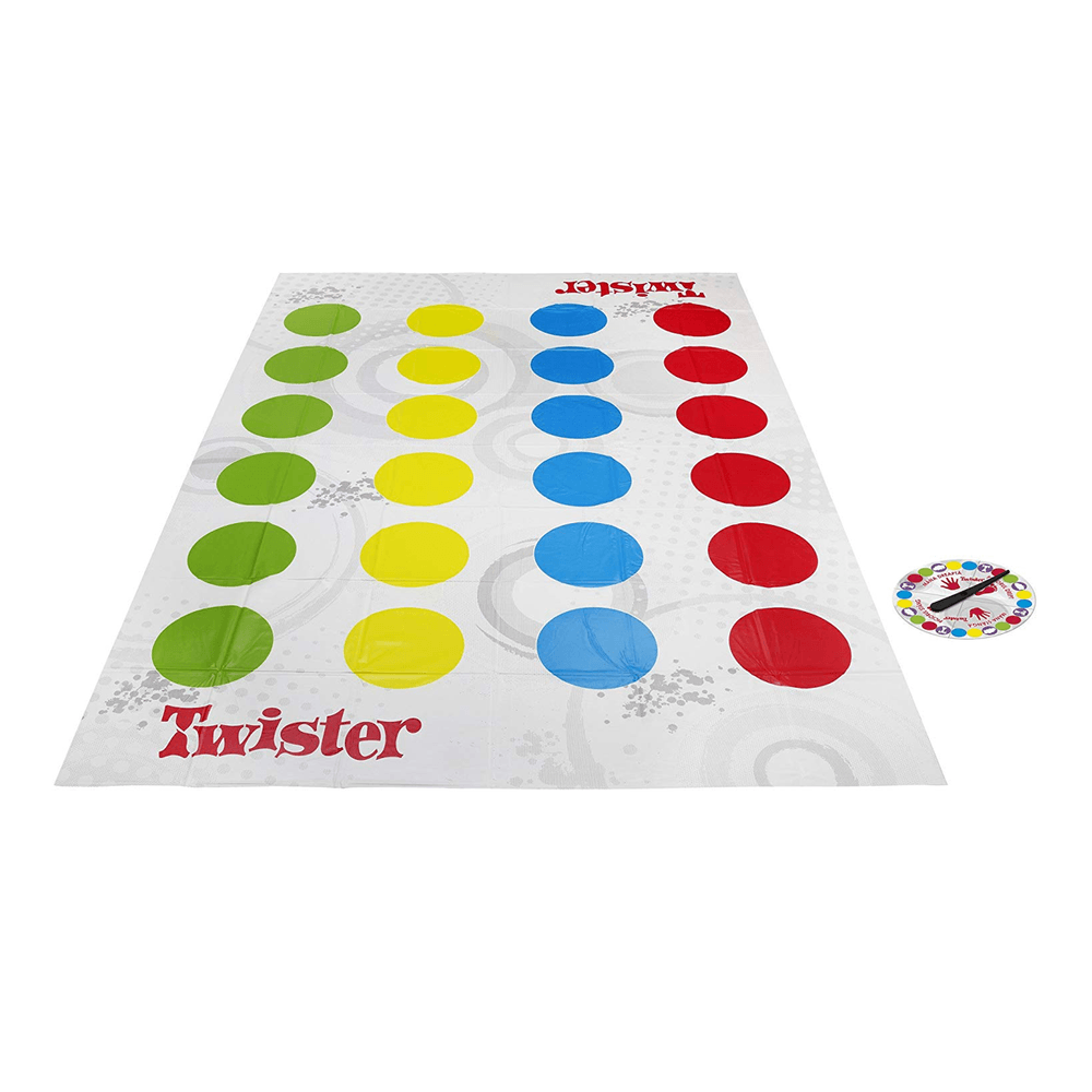 ¡Agregua un toque de diversión a cualquier fiesta o noche familiar con el juego que lo une! Este juego TWISTER es el juego clásico con 2 movimientos más. ¡Dale un giro a la ruleta y mira lo que sigue mientras intentas mantener tus manos y pies sobre la colchoneta! Pie derecho rojo! ¿Puedes hacerlo? Pie izquierdo verde: ¡lo tienes! Si tu rodilla o codo toca la colchoneta, o te caes, estás fuera. ¡Sé el último jugador en ganar!