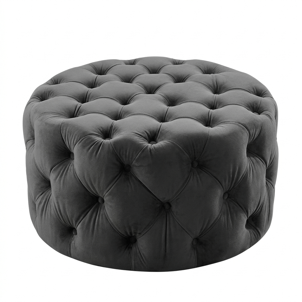 Ottoman redondo con diseño capitoneado que aporta un toque moderno y elegante a cualquier ambiente. Su acolchado cómodo permite utilizarlo como asiento auxiliar o reposapiés, siendo una pieza funcional para salas, dormitorios o espacios de descanso.
