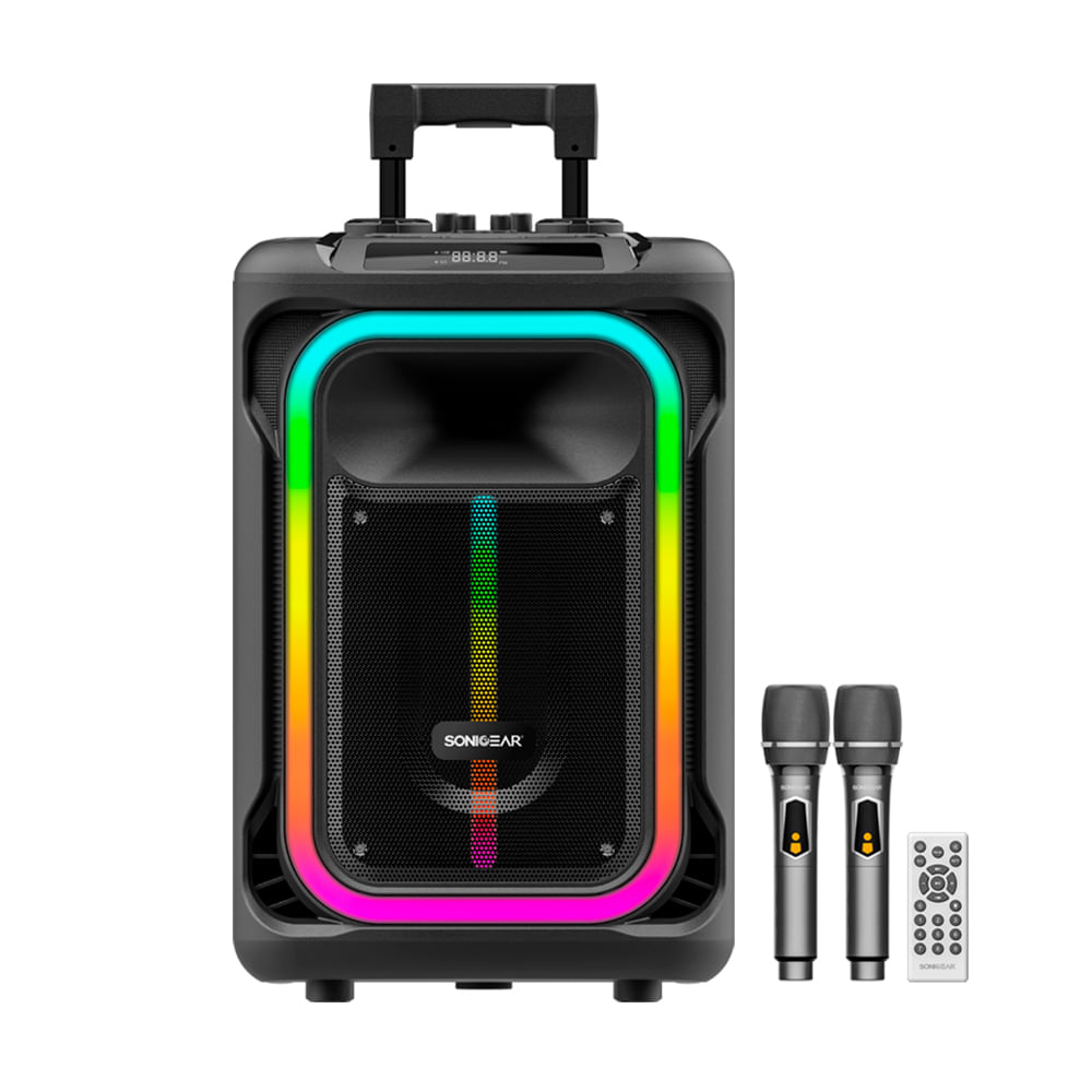 Incorpora efectos de voz, luces RGB predeterminadas sincronizadas con la música y diseño tipo trolley, facilitando su transporte y uso en diferentes espacios. Cuenta con Bluetooth 5.4 + EDR con un alcance de hasta 10 metros y soporte para perfil A2DP, asegurando una conexión estable.