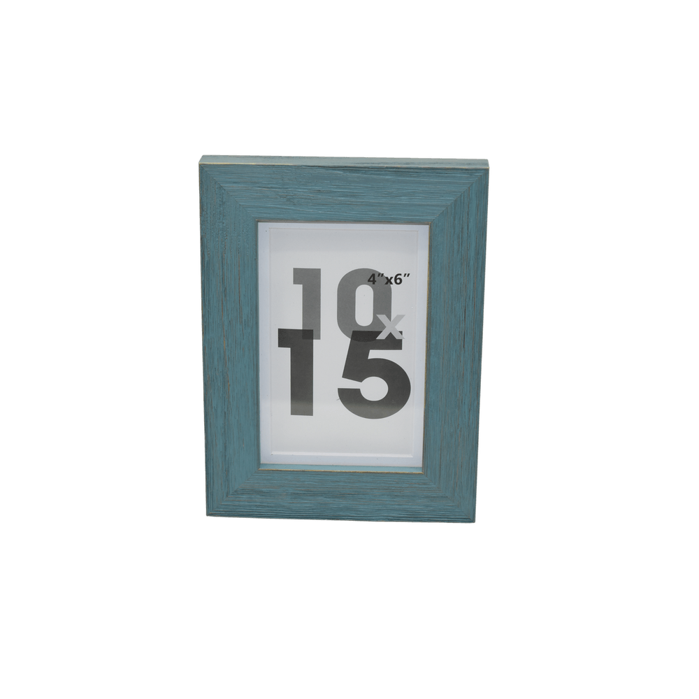Portarretrato de madera en tono azul medio, ideal para fotos 10x15. Aporta un toque fresco y moderno a cualquier espacio.