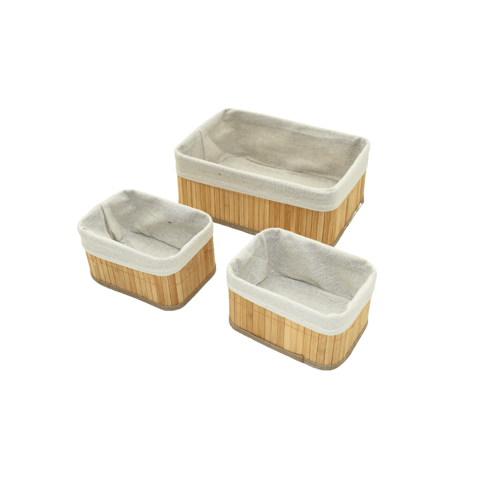 Set decorativo y funcional ideal para organizar objetos pequeños en el hogar. Su estructura de bambú con soporte metálico y forro de poliéster aporta resistencia y un estilo natural.