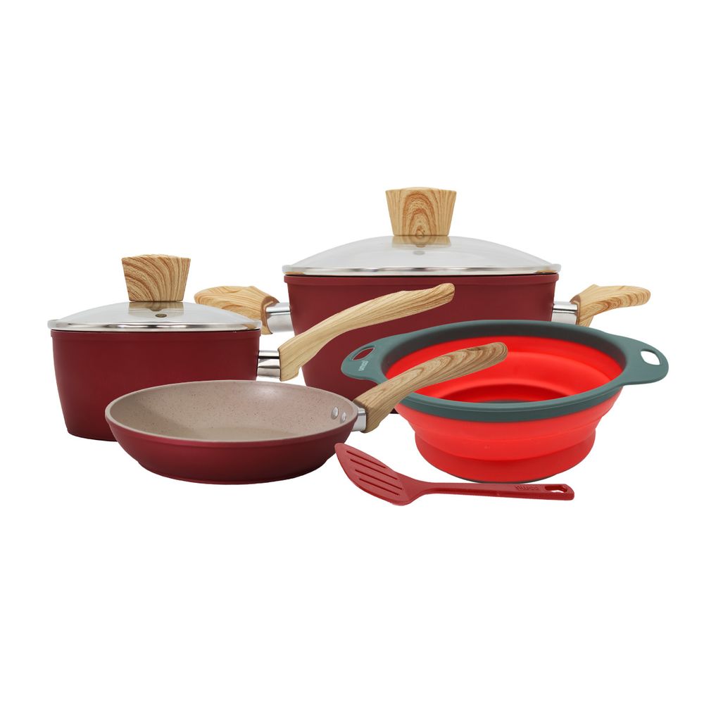Set de ollas burdeo de 7 piezas fabricado en aluminio, diseñado para brindar practicidad y rendimiento en la cocina. Incluye utensilios que facilitan la preparación de diferentes platillos, mientras su material permite una buena conducción del calor para lograr cocciones uniformes. Su acabado en color burdeo aporta un toque moderno y atractivo al espacio de cocina.