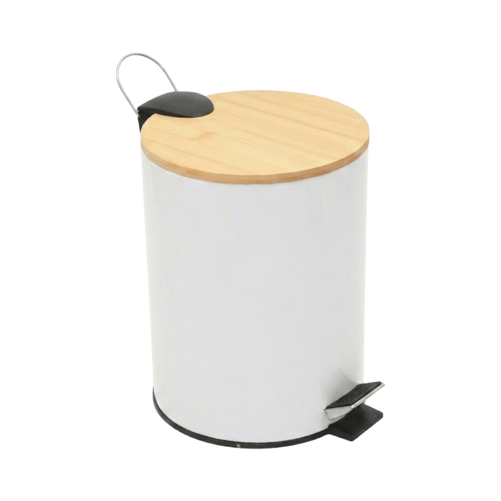 Tacho de basura con pedal fabricado en metal con detalles en bambú, ideal para mantener los espacios limpios con un estilo moderno y natural. Su sistema de apertura con pedal permite un uso más higiénico sin contacto directo, siendo perfecto para baño, cocina u oficina.