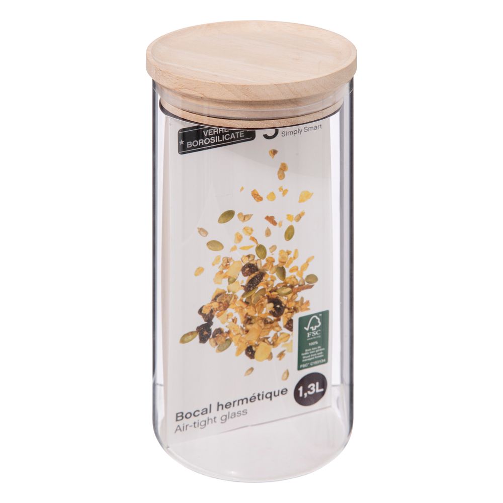 Tarro de cristal con tapa de madera y cierre hermético, ideal para conservar alimentos frescos.