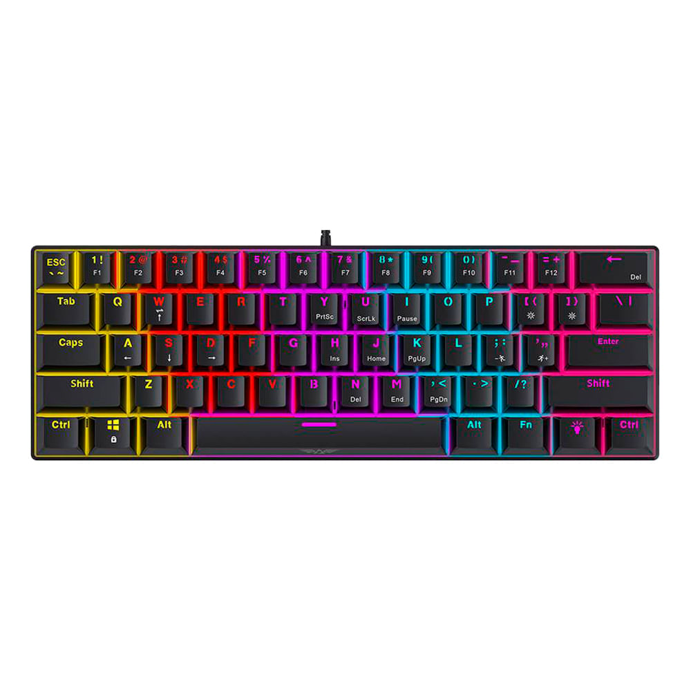 Teclado gaming compacto 60 % con 61 teclas mecánicas tipo Red (switches lineales), que ofrecen respuesta suave, silenciosa y rápida, sin clic audible.