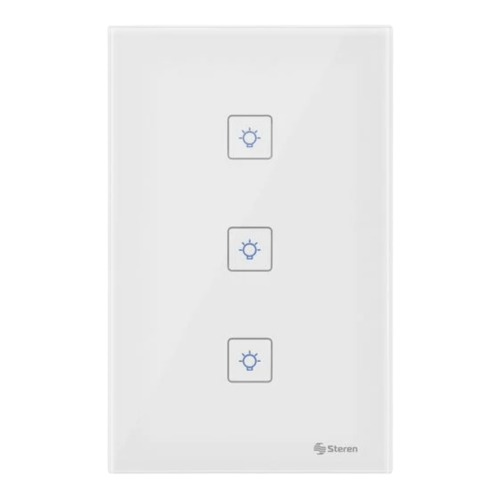 Con este apagador touch Wifi* triple, tendrás iluminación inteligente para controlar y programar, con tu celular o voz, el encendido o apagado, en donde quiera que estés.